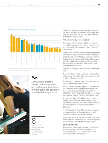 “I am afraid, Mr Pennington, if I let you loose on my middle management they might stop running after the carrot. We cannot and do not want to run that risk.” This reluctant attitude towards equipping employees with soft skills is not uncommon. Employees should be self-reliant, committed, responsible, perceptive, creative and all that, certainly, but not too much so. They might become aware of the price they are paying for running after their carrot – and reconsider their options. The idea is: “Lord, let it rain, but don’t make them wet”. Thus soft skills are clearly a matter of business ethics and philosophy. Is business there to serve the people or is it the other way round?