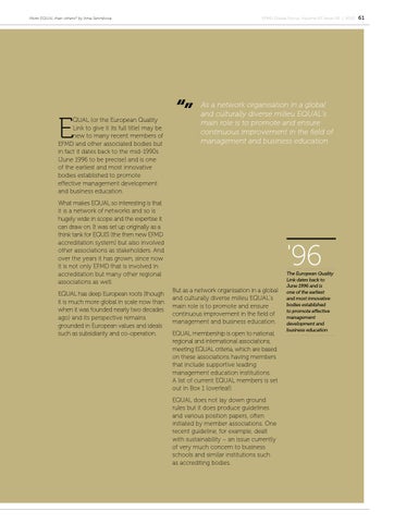 '96 But as a network organisation in a global and culturally diverse milieu EQUAL’s main role is to promote and ensure continuous improvement in the field of management and business education. EQUAL membership is open to national, regional and international associations, meeting EQUAL criteria, which are based on these associations having members that include supportive leading management education institutions. A list of current EQUAL members is set out in Box 1 (overleaf). EQUAL does not lay down ground rules but it does produce guidelines and various position papers, often initiated by member associations. One recent guideline, for example, dealt with sustainability – an issue currently of very much concern to business schools and similar institutions such as accrediting bodies.
