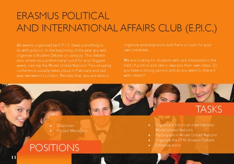 ERASMUS POLITICAL AND INTERNATIONAL AFFAIRS CLUB (E.P.I.C.) All events organised by E.P.I.C. have something to do with politics. In the beginning of the year you will organise a Student Debate on campus. This debate also serves as a preliminary round for your biggest event, namely the Model United Nations! This amazing conference usually takes place in February and last year we went to London. Besides that, you are able to