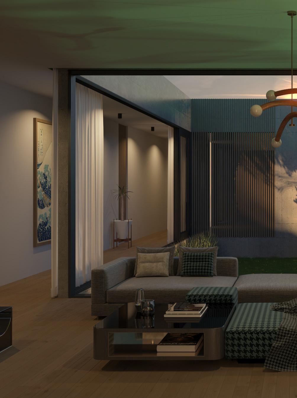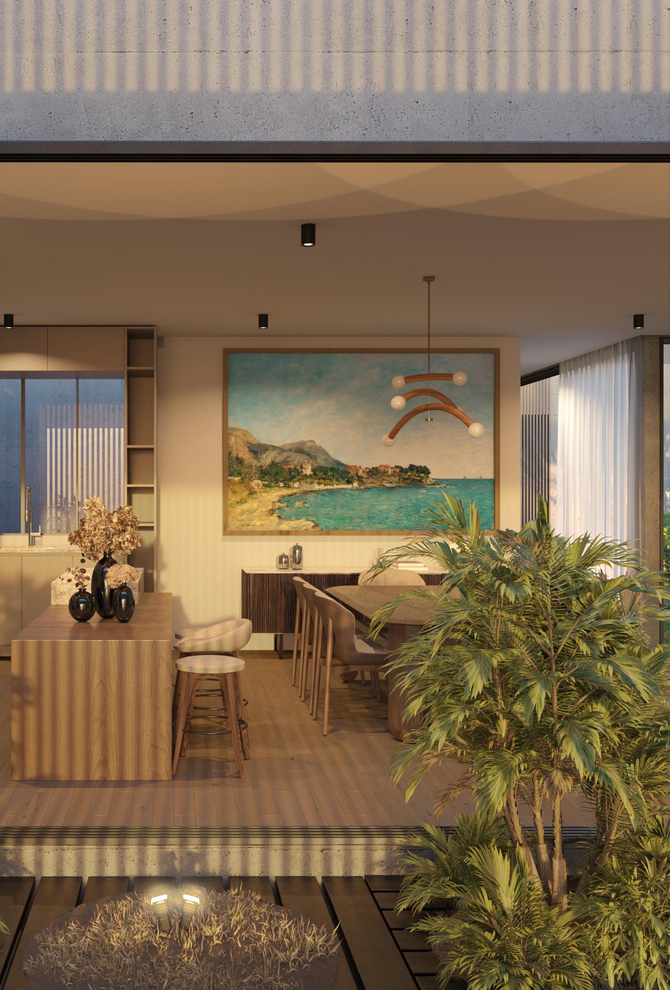 Además, gracias a la presencia de la doble altura al extremo derecho del comedor, la luz natural indirecta penetra a lo largo del día, acentuando el concepto de un oasis de luminosidad y diseño.