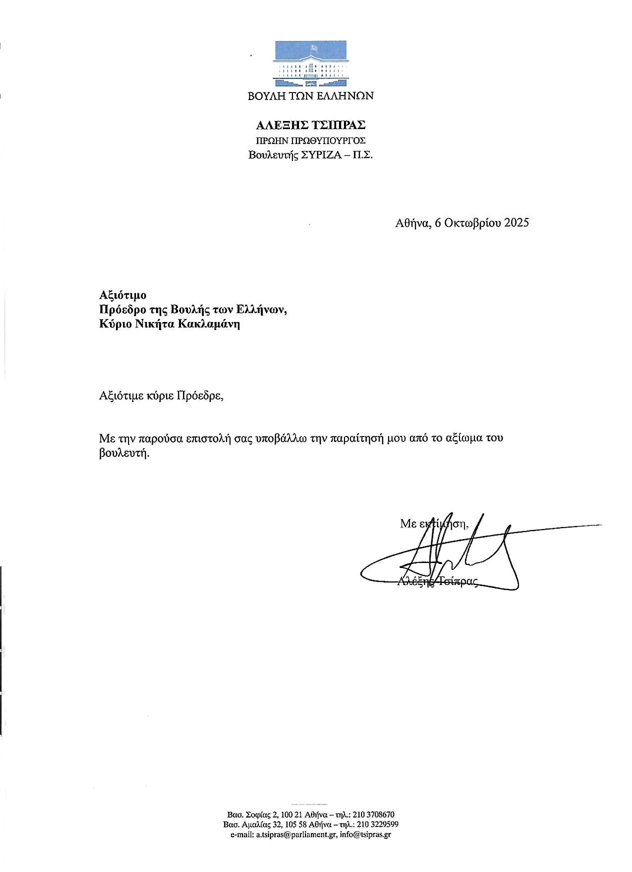Επιστολή παραίτησης Αλέξη Τσίπρα