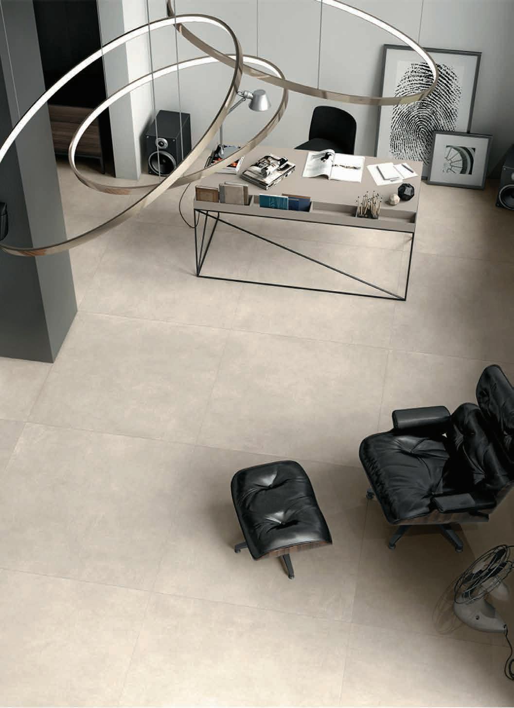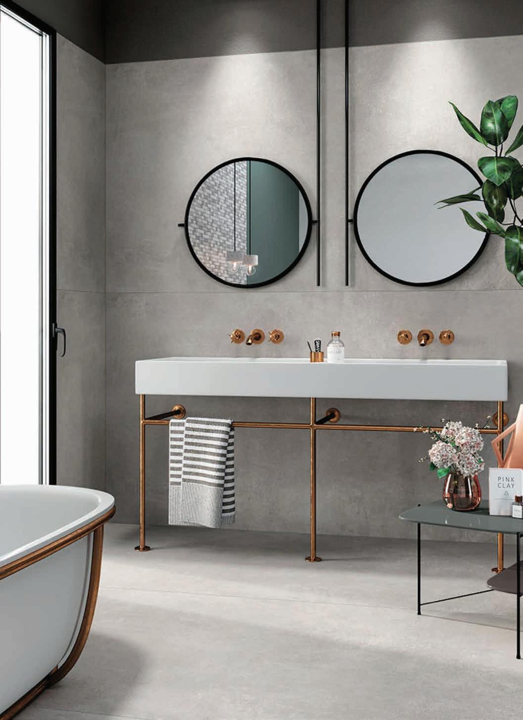 The selection of concrete look tiles come in three finishes - natural, grip and semipolished with the grip finish also being available in a 20mm or 30mm paver - perfect for making a seamless transition from indoors to outdoors. The two steel looks come in a semi-polished finish in thicknesses 6mm or 9mm. Both styles work beautifully with the rest of the concrete look range and are perfect for making a powerful statement on a feature wall.