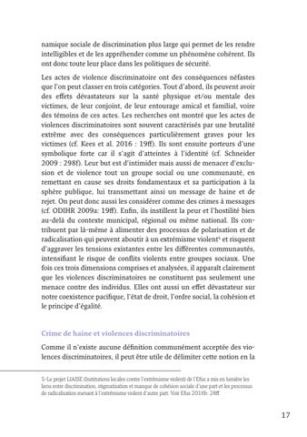 Crime de haine et violences discriminatoires Comme il n’existe aucune définition communément acceptée des violences discriminatoires, il peut être utile de délimiter cette notion en la 5-Le projet LIAISE (Institutions locales contre l’extrémisme violent) de l’Efus a mis en lumière les liens entre discrimination, stigmatisation et manque de cohésion sociale d’une part et les processus de radicalisation menant à l'extrémisme violent d’autre part. Voir Efus 2016b: 28ff.