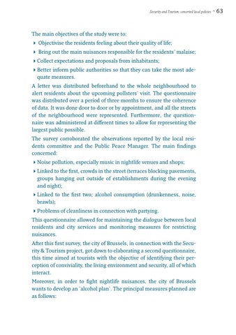 The main objectives of the study were to: Objectivise the residents feeling about their quality of life; Bring out the main nuisances responsible for the residents' malaise; Collect expectations and proposals from inhabitants; Better inform public authorities so that they can take the most adequate measures. A letter was distributed beforehand to the whole neighbourhood to alert residents about the upcoming pollsters' visit. The questionnaire was distributed over a period of three months to ensure the coherence of data. It was done door to door or by appointment, and all the streets of the neighbourhood were represented. Furthermore, the questionnaire was administered at different times to allow for representing the largest public possible. The survey corroborated the observations reported by the local residents committee and the Public Peace Manager. The main findings concerned: Noise pollution, especially music in nightlife venues and shops; Linked to the first, crowds in the street (terraces blocking pavements, groups hanging out outside of establishments during the evening and night); Linked to the first two; alcohol consumption (drunkenness, noise, brawls); Problems of cleanliness in connection with partying. This questionnaire allowed for maintaining the dialogue between local residents and city services and monitoring measures for restricting nuisances. After this first survey, the city of Brussels, in connection with the Security & Tourism project, got down to elaborating a second questionnaire, this time aimed at tourists with the objective of identifying their perception of conviviality, the living environment and security, all of which interact. Moreover, in order to fight nightlife nuisances, the city of Brussels wants to develop an 'alcohol plan'. The principal measures planned are as follows: