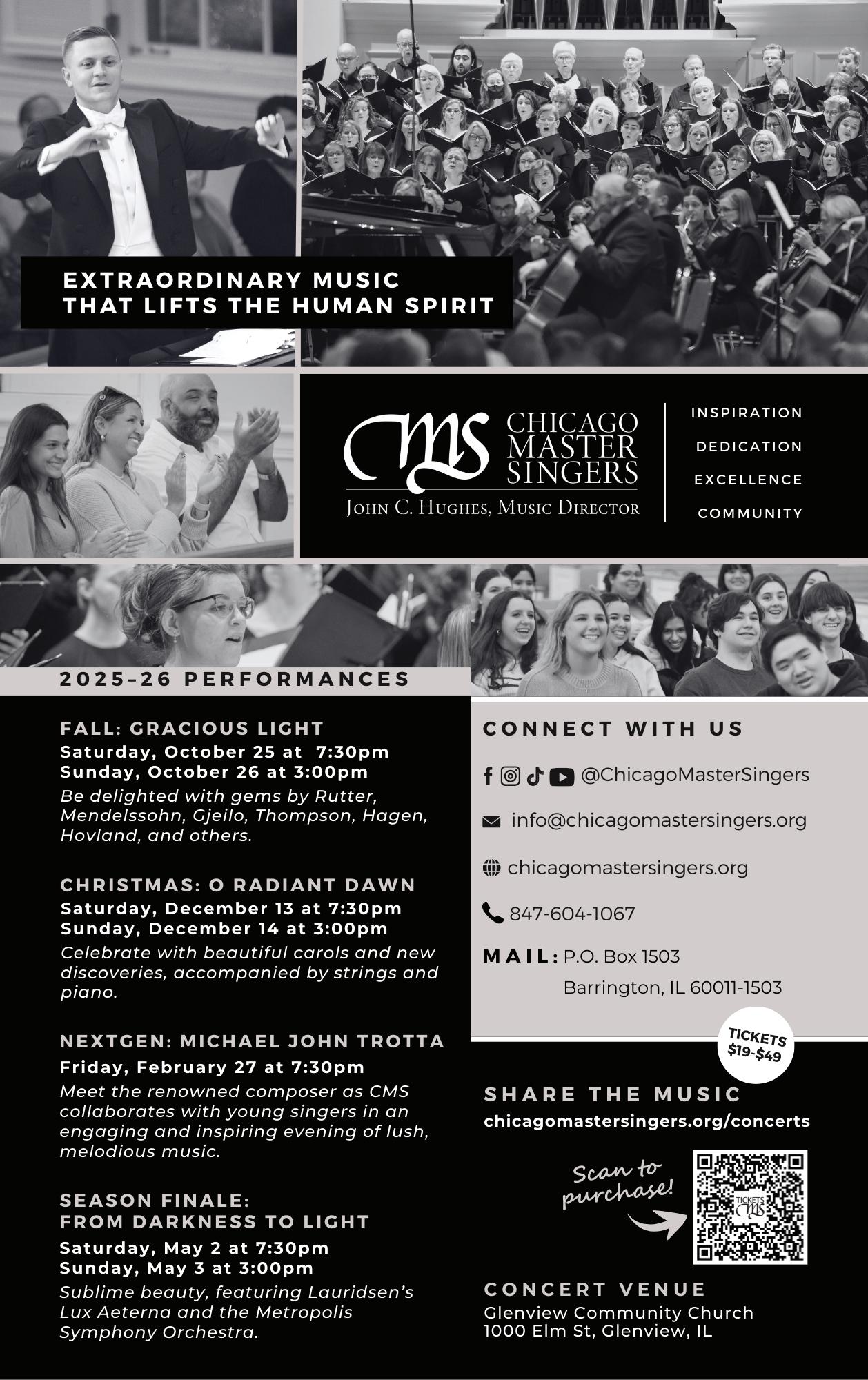 ECC ensembles are regularly sought after for collaborations and have shared the stage with the likes of the Apollo Chorus of Chicago, the Evanston Symphony, Barry Manilow, S.O.U.L. Creations, the Chicago Philharmonic, the Ondas Ensemble and the North Shore Choral Society. Recent seasons have included an Orchestra Hall debut, two full-blown pop/rock concerts with live bands, and premieres of several new songs. The ECC is a past recipient of the Mayor’s Award for the Arts.