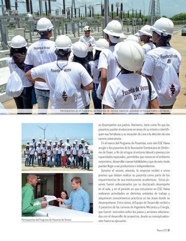se desempeñan sus padres. Asimismo, tiene como fin que los pasantes puedan involucrarse en áreas de su interés e identifiquen sus fortalezas y su vocación de cara a la elección de una carrera universitaria. En el marco del Programa de Pasantías, este año EGE Haina acogió a dos pasantes de la Asociación Dominicana de Síndrome de Down, a fin de integrar al entorno laboral a jóvenes con capacidades especiales, permitirles que conozcan el ambiente corporativo, desarrollar nuevas habilidades y que de este modo puedan llegar a ser productivos e independientes. Durante el verano, además, la empresa recibió a otros jóvenes que debían realizar su pasantía como parte de los requerimientos de sus instituciones académicas. Estos jóvenes fueron seleccionados por su destacado desempeño en el aula, y en el periodo en que estuvieron en EGE Haina realizaron actividades en distintas unidades de trabajo y adquirieron conocimientos prácticos en las áreas donde se desempeñaron. Entre éstas, el Equipo de Desarrollo recibió a 3 pasantes de las carreras de Ingeniería Mecánica y Energía, que fueron instruidos sobre los pasos y acciones relacionadas con el desarrollo de proyectos, desde su conceptualización hasta su ejecución. Memoria 2017 | 87