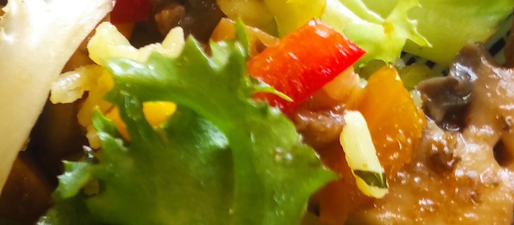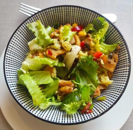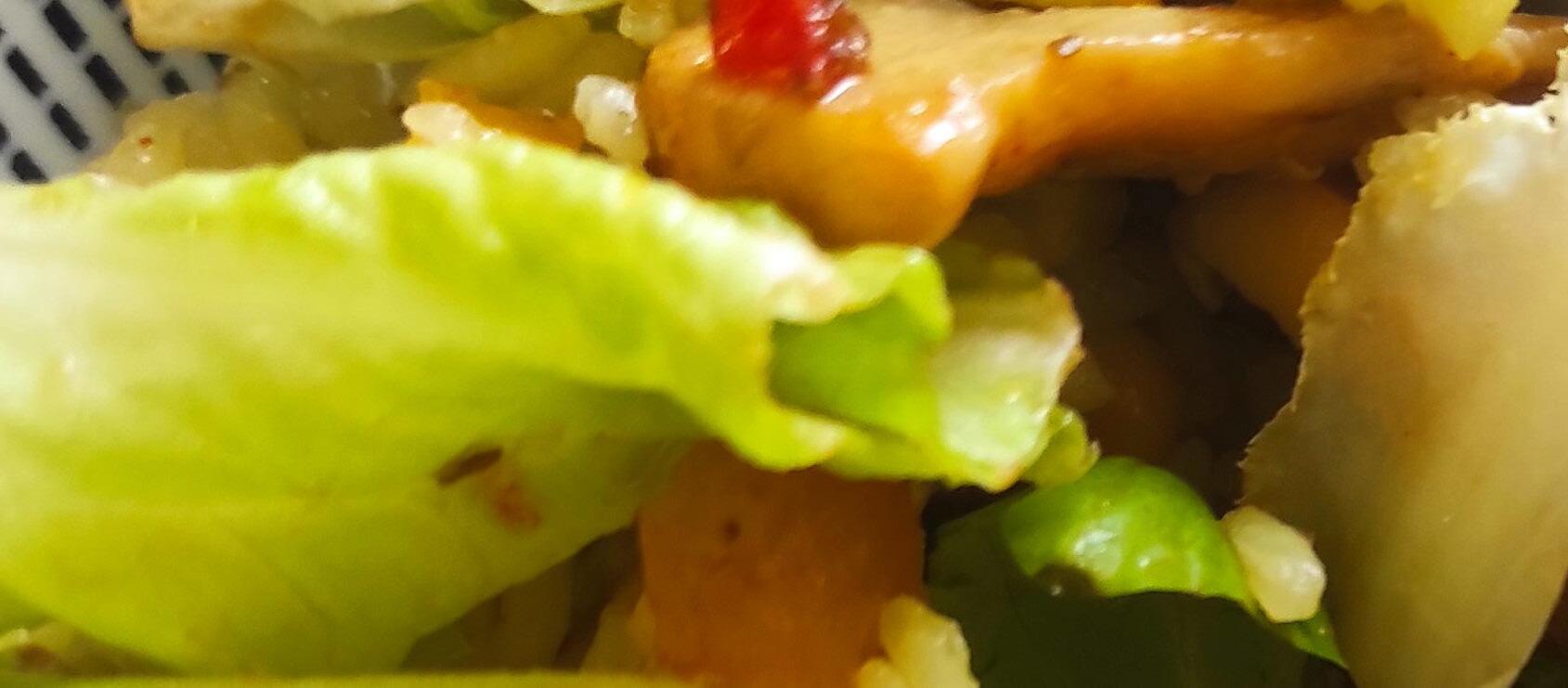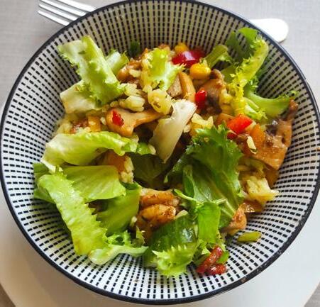 5. Ha megpuhult a gombánk, és a rizsünk is kész, keverjük össze őket, szórjuk meg a salátával és dobozoljuk.