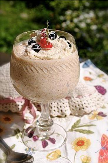 4. Utána belerakhatjuk a magvakat és a nyers gyümölcsöket, ha az édesebb ízeket kedveljük, akkor egy kanál mézet is.