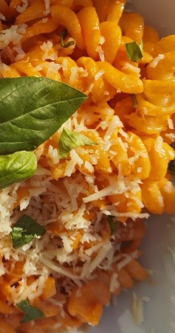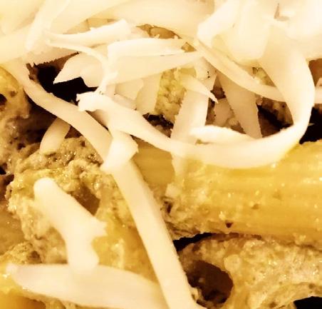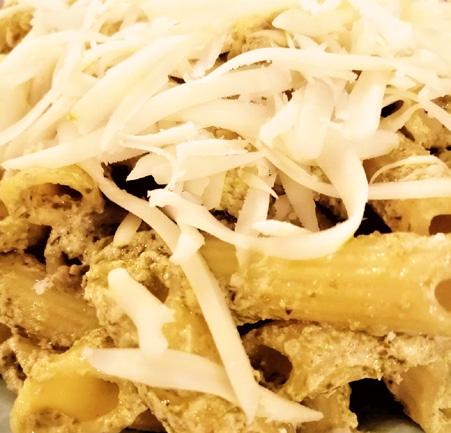 3. Összeállítjuk a szószt (pesztó, tejföl, olivaolaj) ráöntjuk a tésztára, összeforgatjuk és megszórjuk reszelt sajttal.