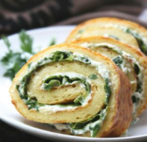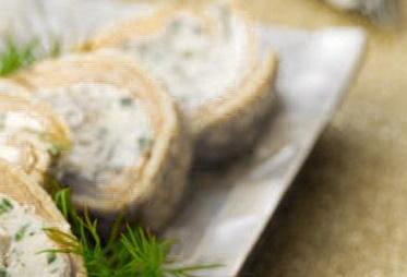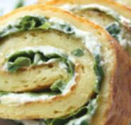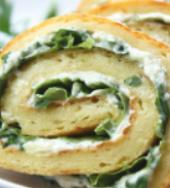 5. Kenjük a sajtkeveréket a tetejére, terítsük rá a megmosott és megszárított salátaleveleket és a tekercset a szélesebb végétől kezdve hajtsuk össze, az összeillesztést hagyjuk alul.