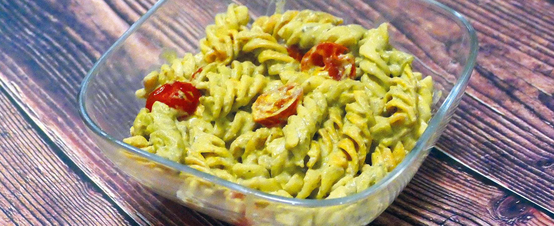 2. Közben az avokádót, kesudiót, tejet, bazsalikomot, citromlevet, fokhagymát és a fűszereket egy turmixgépben krém állagúvá turmixoljuk.