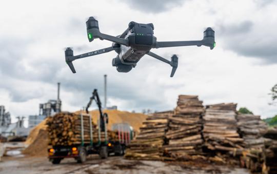 Drohnen helfen bei der Bestandsaufnahme auf Holzplätzen. So müssen die Mitarbeitenden den Holzplatz nicht mehr betreten, um die Inventur durchzuführen. Die Drohnen fliegen eine vorprogrammierte Strecke und machen alle paar Sekunden Fotos von den Holzstapeln. Diese werden dann ausgewertet und zu einer Karte mit genauen 3D-Bildern zusammengefügt. So kann schneller Inventur gemacht werden und es gibt genauere Daten über die einzelnen Sortimente.