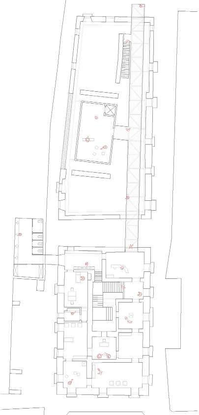 Le Palazzo Falcetti est séparé de son mitoyen au Nord pour limiter les vulnérabilités en cas de séisme, d’après le constat de désordres à leur jonction. Le bâtiment Sud abrite un escape game au rdc et des archives numériques à l’étage, recréées via témoignages et recherches. Cette « machine à mémoire » convertit l’histoire en supports immersifs : 5D, projections, hologrammes…