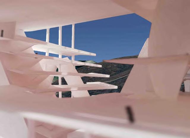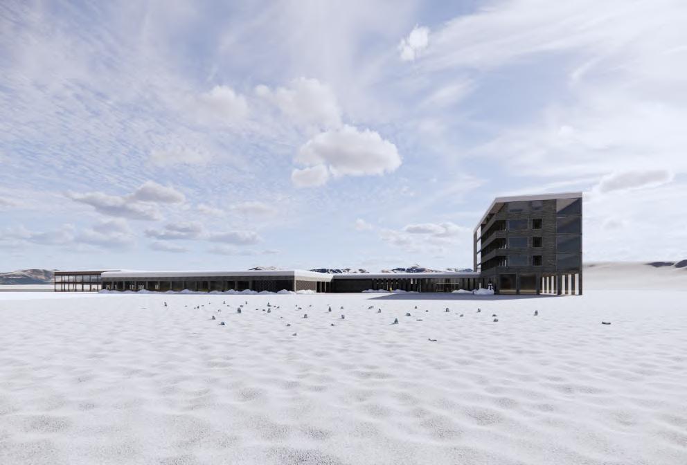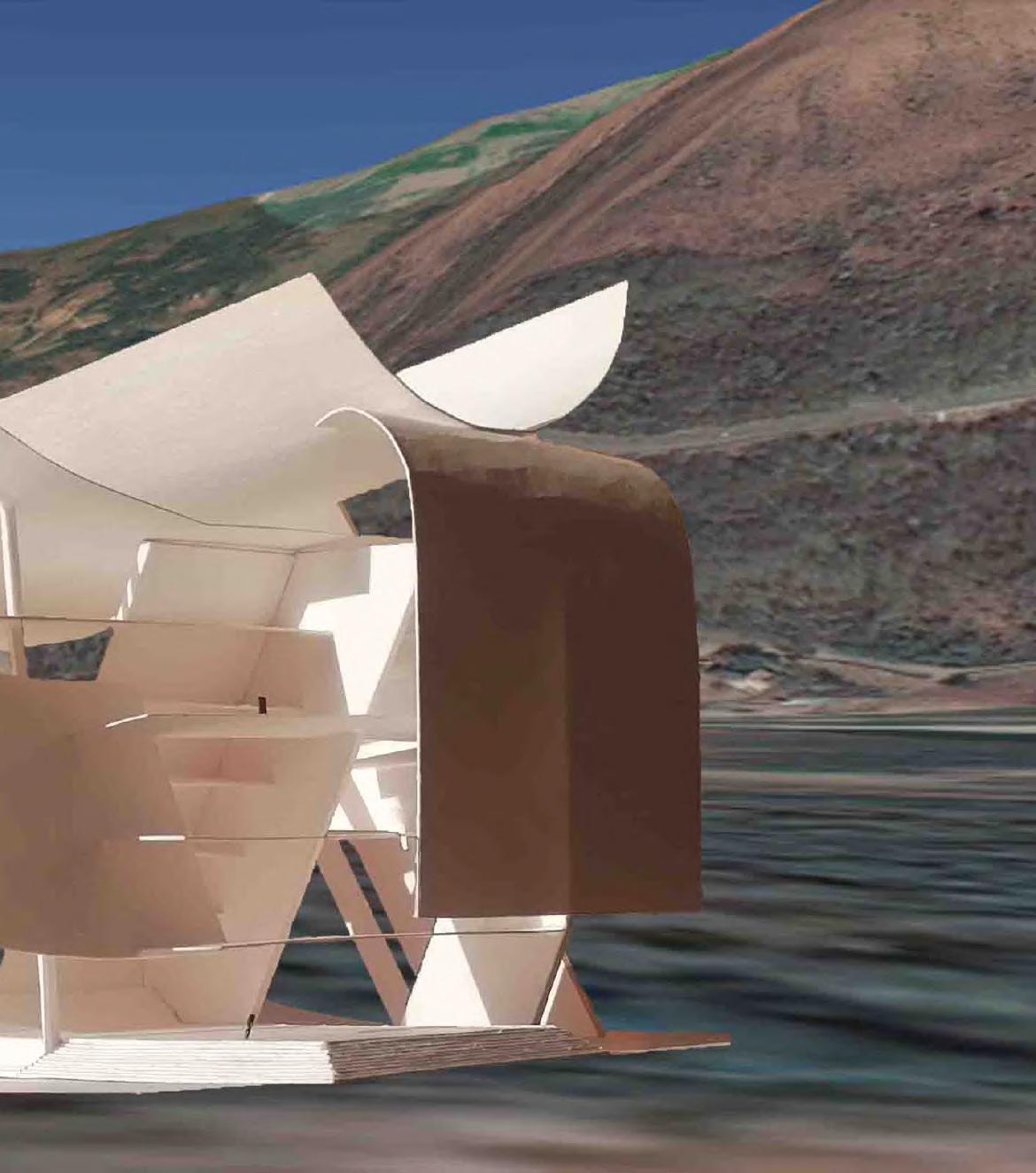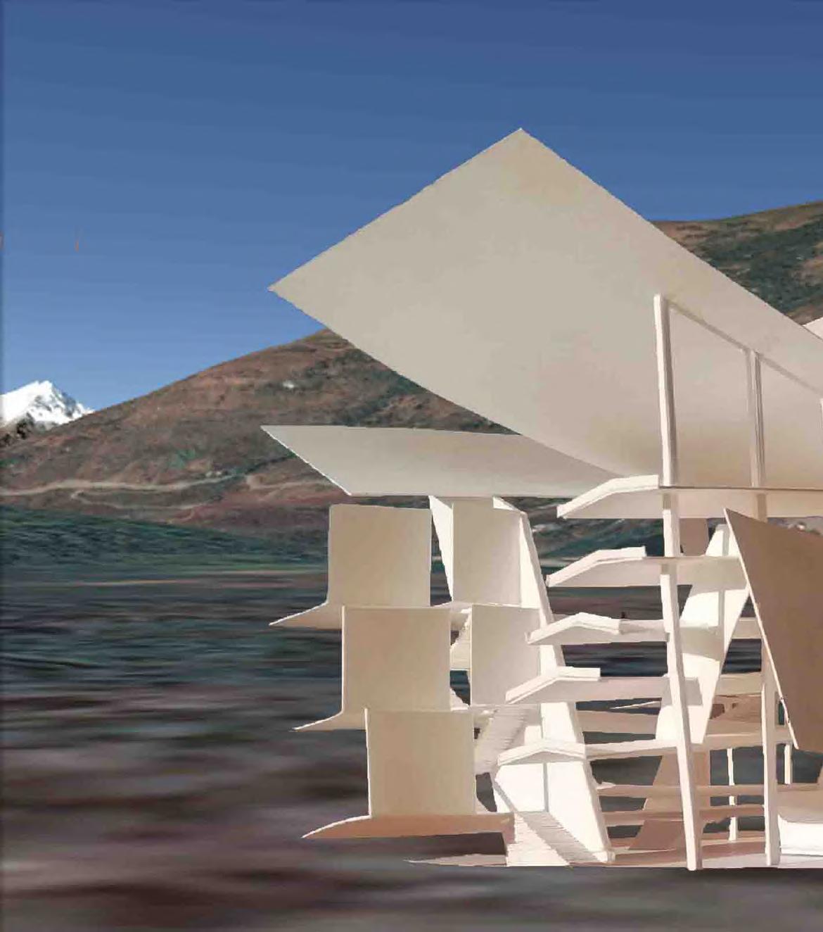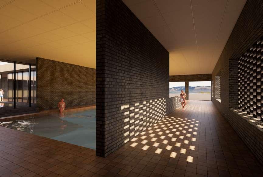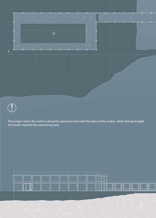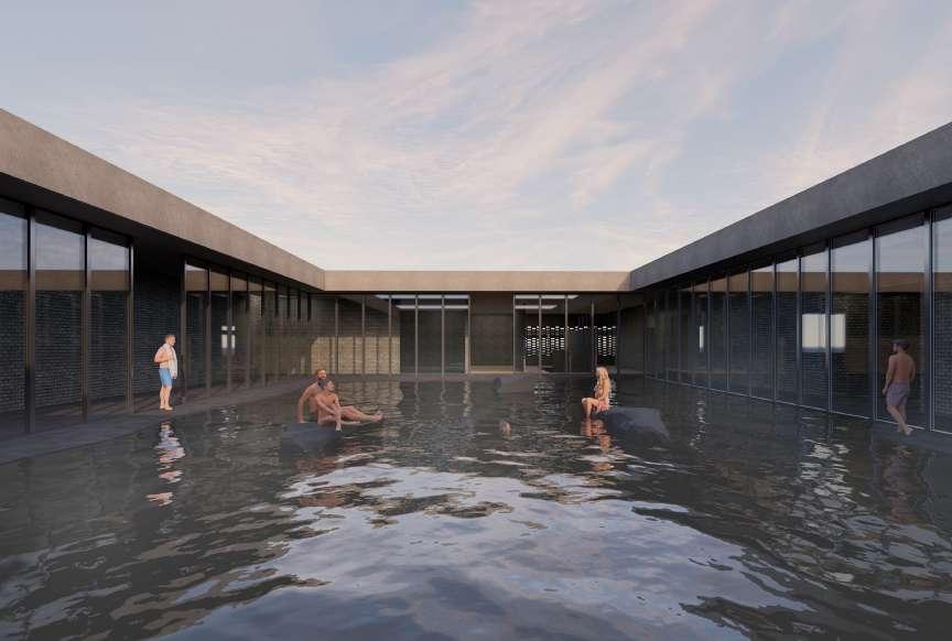 Le projet s’organise en deux corps de bâtiment, un premier vertical répondant à la falaise et comprenant le complexe hôtelier, et un deuxième horizontal faisant écho à la surface de l’eau. Celuici abrite des bassins à différentes vertus thérapeutiques, des salles de massages et saunas, une salle de yoga et aromathérapie ainsi qu’une salle de poterie.