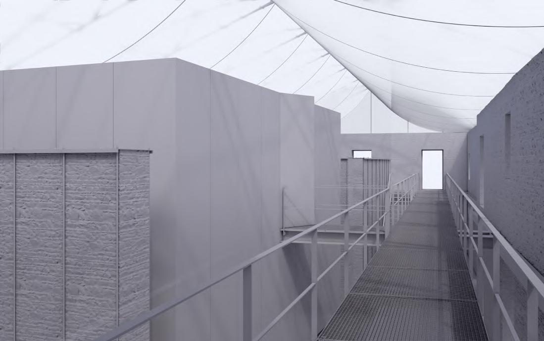 La passerelle permet aussi d’accéder à une boîte métallique contenant des immersions 5D liées au musée - archives. Cette boîte est le symbole de la machine à mémoire qui avale les visiteurs, leur fait vivre une expérience qui leur donne une partie d’histoire à s’approprier, et les fait ressortir changés, avec un nouveau regard sur la ruine qui les entoure.