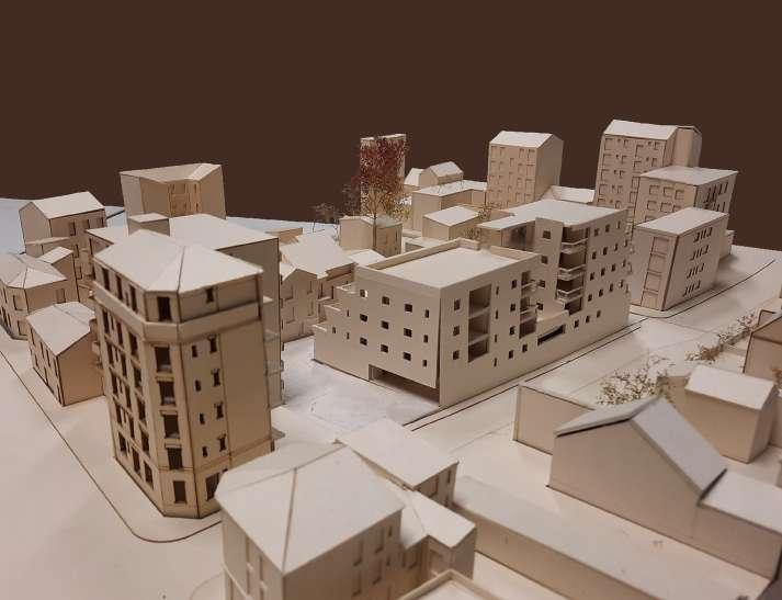 Maquette d’insertion des projets du PFE dans le paysage de Ceccia (éch. 1 : 500). De gauche à droite : projet de logements et commerce, agrandissement de l’école, halle agricole, en face du présent projet de place et de logements.