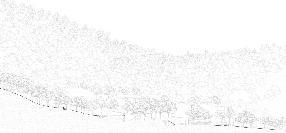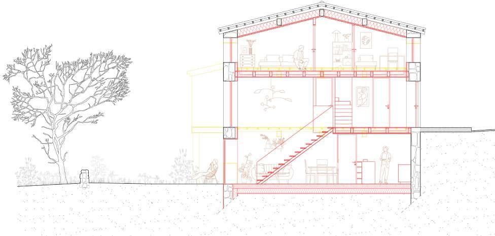 Mais le point de départ de cette redensification habitante est la réhabilitation de maisons abandonnées. Deux projets ont été développés : le premier traite trois maisons accolées à l’abandon. Leur inscription dans un dénivelé