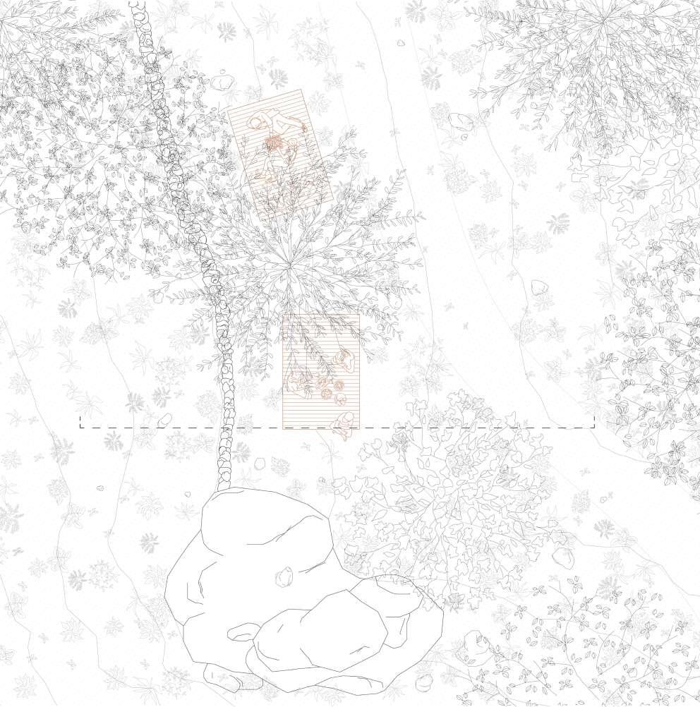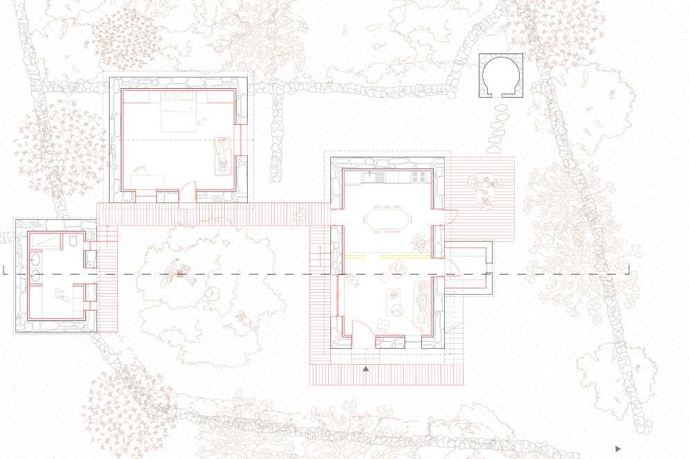 Le second projet traite trois bâtiments abandonnés – une maison paysanne et deux cabanes – gravitant autour d’un espace extérieur. L’ensemble est unifié en une même habitation intérieure-extérieure : les espaces sont décomposés entre les différents bâtiments pour mieux les mettre en relation et donner vie à l’ensemble par l’extérieur. L’habitant profite ainsi du jardin comme lien entre tous les lieux de la maison dans un climat méditerranéen.