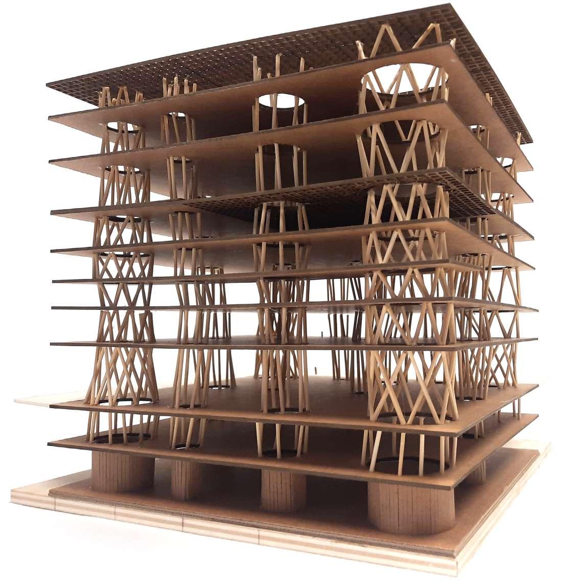 Maquette d’un projet parasismique contemporain existant, la Médiathèque de Sendai, Japon (Toyo Ito, 2001). Échelle 1 : 200.