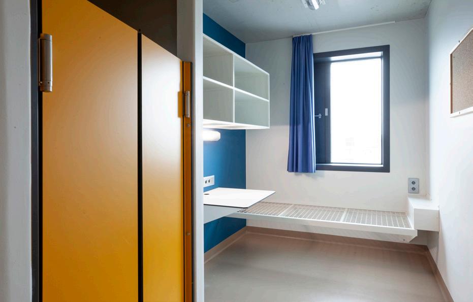 environment stimulates good behaviour and a more humane approach to the detainees. This increases the chances of successful resocialization and a significant reduction in the level of recidivism. And it creates a more pleasant working environment for staff. The various functions such as cells, workshops, social areas, sports facilities and therapy rooms are housed in separate, recognizable buildings. Detainees can
