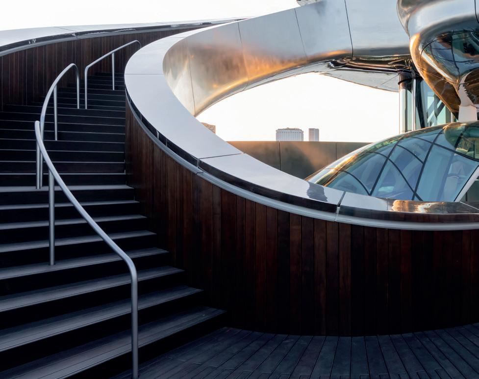 wervelende trappen en glazen platformen sluiten netjes en comfortabel aan bij de publieksfunctie van het museum. Uiteindelijk waarborgen technologische hoogstandjes, zoals automatische scenario’s voor uitzetting en krimp, de duurzaamheid en betrouwbaarheid van de Tornado.