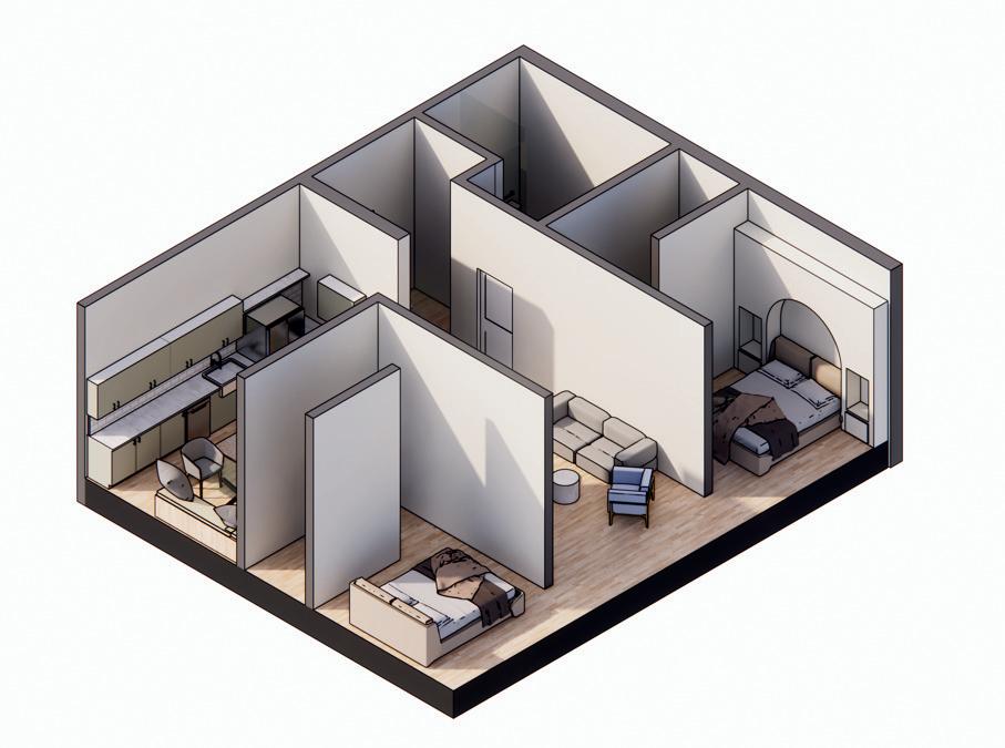 The concept behind this design was serenity. To apply this idea, muted colors and natural materials were used throughout. When space planning, ease of travel was heavily considered for a “serene” environment where the residents are not troubled to do everyday tasks. Proper lighting to ensure the space was lit for the aging eye was also crucial to the project. The units were designed using both ADA regulations and Universal Design Principles to cater to all. Thinking about the entry sequence, the entry hall was all about the details. Each door was equipped with a shelf for the residents to customize. Not only does it bring a personalization to the space, but it is also a reminder to residents with declining memory to locate their room. The layout tends to the occupants' needs whether that be a fully accessible apartment or just a final place for couples to make memories.