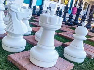 greens sit alongside interesting sculptures, and a giant chess board where guests are invited to test their skills. There’s a lawn with rocking chairs and a fire pit too. Meanwhile, the heated pool offers comfortable loungers and poolside cabanas. Throughout the property, there are also filtered water stations.
