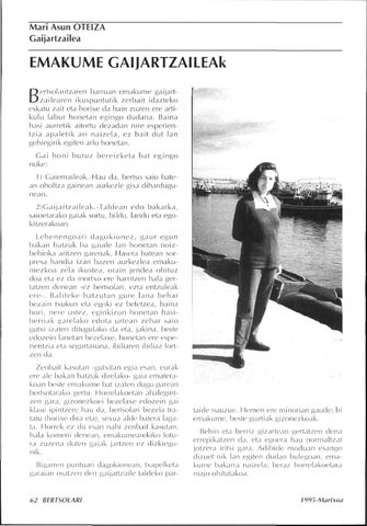 ertsolaritzaren barruan emakume gaijartzailearen ¡kuspuntutik zerbait ¡dazteko eskatu zait eta horixe da hain zuzen ere artikulu labur honetan egingo dudana. Baina hasi aurretik aitortu dezadan ñire esperientzia apaletik ari naizela, ez bait dut lan gehiegirik egiten arlo honetan. Gai honi buruz bereizketa bat egingo nuke: 1) Gaiemaileak.-Hau da, bertso saio batean oholtza gainean aurkezle gisa dihardugunean. 2)Ga¡jartza¡leak.-Taldean edo bakarka, saioetarako gaiak sortu, bildu, landu eta egokitzerakoan. Lehenengoari d a g o k i o n e z , gaur egun bakan batzuk ha gaude lan honetan noizbehinka aritzen garenak. Hasera batean sorpresa handia izan bazen aurkezlea emakumezkoa zela ¡kustea, orain jenclea ohituz doa eta ez da inortxo ere harritzen hala gertatzen denean -ez bertsolari, ezta entzuleak ere-. Baliteke batzutan gure lana behar bezain txukun eta egoki ez betetzea, baina hori, nere ustez, eginkizun honetan hasiberriak garelako edota urtean zehar saio gutxi izaten ditugulako da eta, jakina, beste edozein lanetan bezelaxe, honetan ere esperientzia eta segurtasuna, ibiliaren ibiliaz lortzen CÍA. Zenbait kasutan -gutxitan egia esan, eurak ere ale bakan batzuk direlako- gaia ematerakoan beste emakume bat izaten dugu parean bertsotarako gertu. Horrelakoetan ahalegintzen gara, gizonezkoei bezelaxe edozein gai klase ipintzen; hau da, bertsolari bezela tratatu (horixe dirá eta), sexua alde batera lagata. Horrek ez du esan nahi zenbait kasutan, hala komeni denean, emakumearekiko lotura zuzena duten gaiak jartzen ez dizkiegunik. Bigarren puntúan clagokionean, txapelketa garaian osatzen dvn gaijartzaile taldeko par-