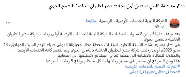 مسارملاو ةماعلا تاقلاعلل ةماعلا ةرادلاا ناريطلل رصمل ةضباقلا ةكرشلا فقوت دعب يوجلا نحشلل ناريطلل رصم تلاحر ىلوأ لبقتس"ي يبيللا ةقيتيعم راطم 8 روص | تاونس ةكرش تلاحر ىلوأ تبسلا سمأ يلودلا ةقيتيعم " راطم ةطحم لابقتسا نع هيبيل رداصم تدكأ ناريطلل رصمةصاخلا نم رثكا ماد فقوت دعب يوجلا نحشلاب 8 تاونس . ىلإ ةفاضلإاب ةرئاطلل ةلوانملاو ةيضرلأا تامدخلا ةفاك ميدقت مت هنأ ،ةيضرلأا تامدخلل ةيبيللا ةكرشلا تلاق ،لصتم قايس يف اهباحصأ ىلإ اهميلستو عئاضبلا نيزخت ةيلمع. عقاوب مظتنم لكشب اهتلاح7ر 7 رييست يف 7 رمتست نأ عقوتملا نم هنأ ىلإ ،تامدخلل ةيبيللا ةكرشلا تراشأو 5 ايعوبسأ تلاح7ر .