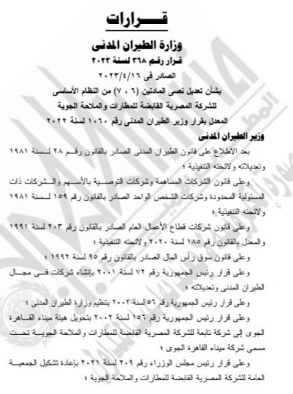 مسارملاو ةماعلا تاقلاعلل ةماعلا ةرادلاا ناريطلل رصمل ةضباقلا ةكرشلا ماظنلا نم نيتدام ليدعت نأشب يندملا ناريطلا ةرازو رارق رشنت ةيمسرلا ةديرجلا تاراطملل ةضباقلا ة"يرصمل"ا ةكرشلل يساسلأا ترشنةيمسرلا ةديرجلا يف رداصلا يندملا ناريطلا ة"را"زو رارق 2023|4|16 نيتداملا يصن ليدعت نأشب ، 6 7و نم ، مقر يندملا ناريطلا " ريزو رارقب لدعملا ةيوجلا ةحلاملاو تا"راطملل ةضباقلا ةيرصملا ةكرشلل يساسلأا ماظنلا 1060 ةنسل 2022 . نيتداملا يصنب لدبتسي :يلاتلاك ةيمسرلا ةديرجلا هترشن يذلا رارقلا صن ءاجو 7،6 ةكرشلل يساسلأا ماظنلا نم مقر رارقلاب رداصلا ةيوجلا ةحلاملاو تاراطملل ةضباقلا ةيرصملا ةنسل1002 2001 ناريطلا ريزو رارقب لدعملاو مقر يندملا ةنسل1060 2022 نايتلآا ناصنلا : ةداملا 6 غلبمب هب صخرملا ةكرشلا لام سأر ددح : 30،000،0 ،7ريغ لا يرصم هينج 7 رايلم نوثلاث طقف( يرصم هينج غلبمب عوفدملاو ردصملا لاملا سأر ددحو 9.360.000.000 نويلم نوثلاثو ةئامتسو تارايلم ةعست طقف يرصم هينج ريغ لا يرصم هينج. ةداملا 7 ددع نم عوفدملاو ردصملا ةكرشلا لام سأر نوكتي : 96.300.000 فلأ ةئامثلاثو انويلم نوعستو ةتس( مهس ةلودلل ةكولمم يرصم هينج ةئام مهس لك ةميق مهس.