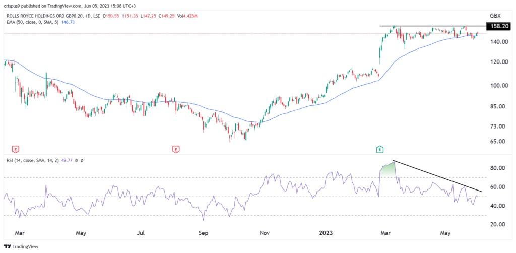 The daily chart shows that the RR share price has been in a strong bullish trend for a few months. Recently, however, the stock has struggled moving above the key resistance level at 158.20p. It remains slightly above the 50-day moving average while the Relative Strength Index )RSI( has formed a bearish divergence pattern. Therefore, the outlook of the stock is neutral for now. More upside will be confirmed if it moves above the key resistance point at 158.20p. A move above that level will see it jump to 200p, as I wrote in this article.