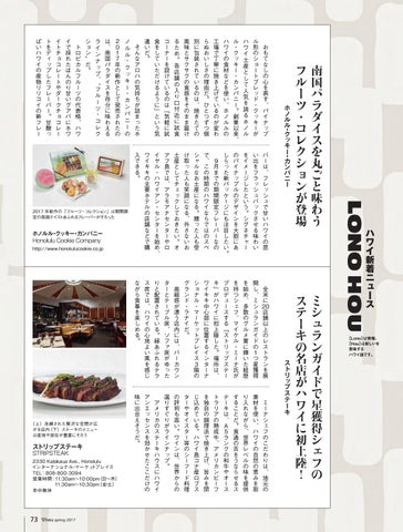 そんなアロハの気持ちが詰まったホ ノ ル ル・ ク ッ キ ー・ カ ン パ ニ ー の 2017年の新作として発売されたの は、南国パラダイスを存分に味わえる ラ イ ン ナ ッ プ、〝 フ ル ー ツ・ コ レ ク ション〟だ。 トロピカルフルーツの代表格、ハワ イで採れたほんのり甘いグアバにホワ イトチョコレートやダークチョコレー
