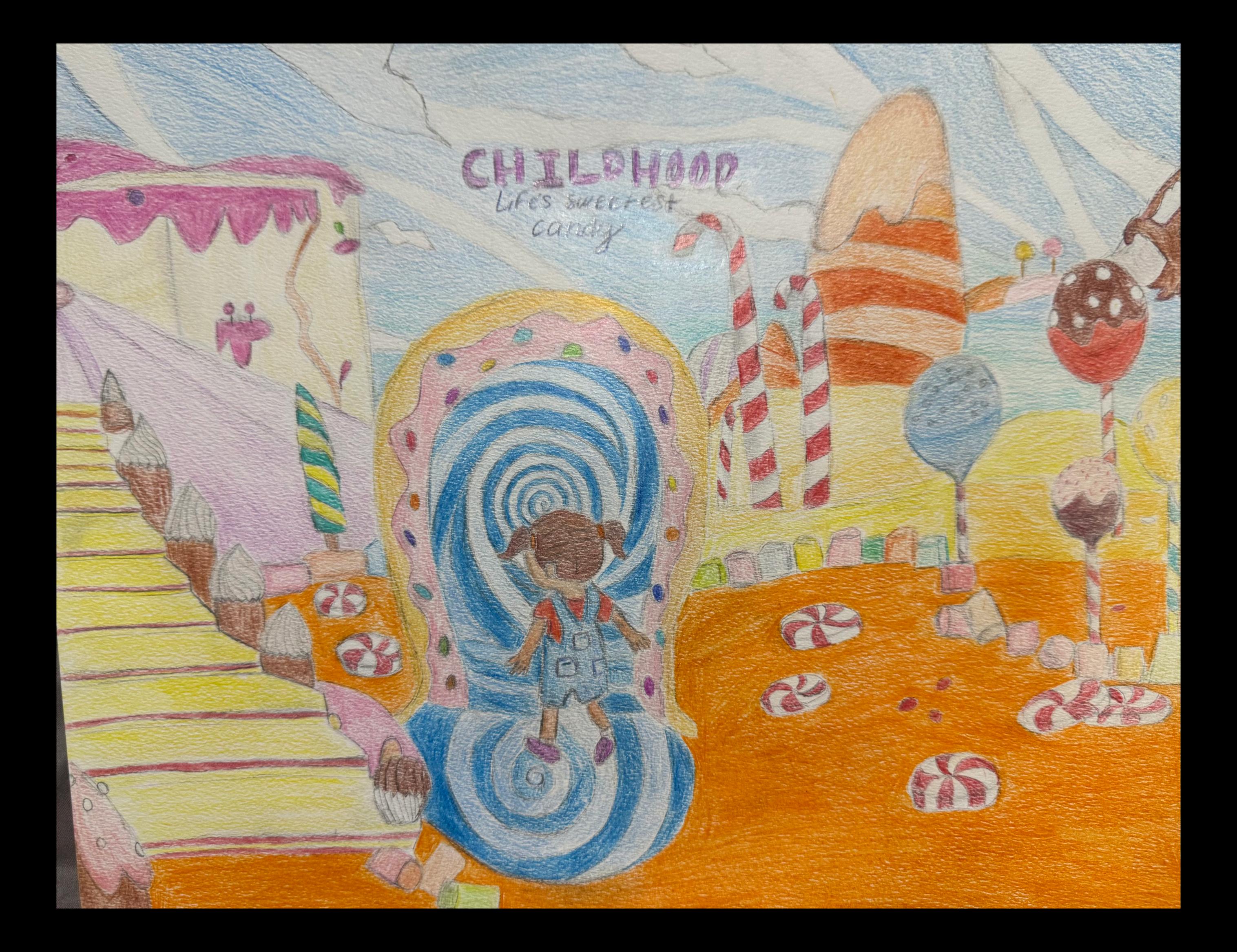 This piece shows a child stepping through a swirling, candy-colored portal into a bright, fantasy world, filled with sweets and colors. The candy landscape represents the sweetness and wonder of childhood, while the portal symbolizes a threshold, crossing from reality into imagination. The artwork reflects how childhood itself is a transformative doorway, a space where the world feels magical and full of possibility.