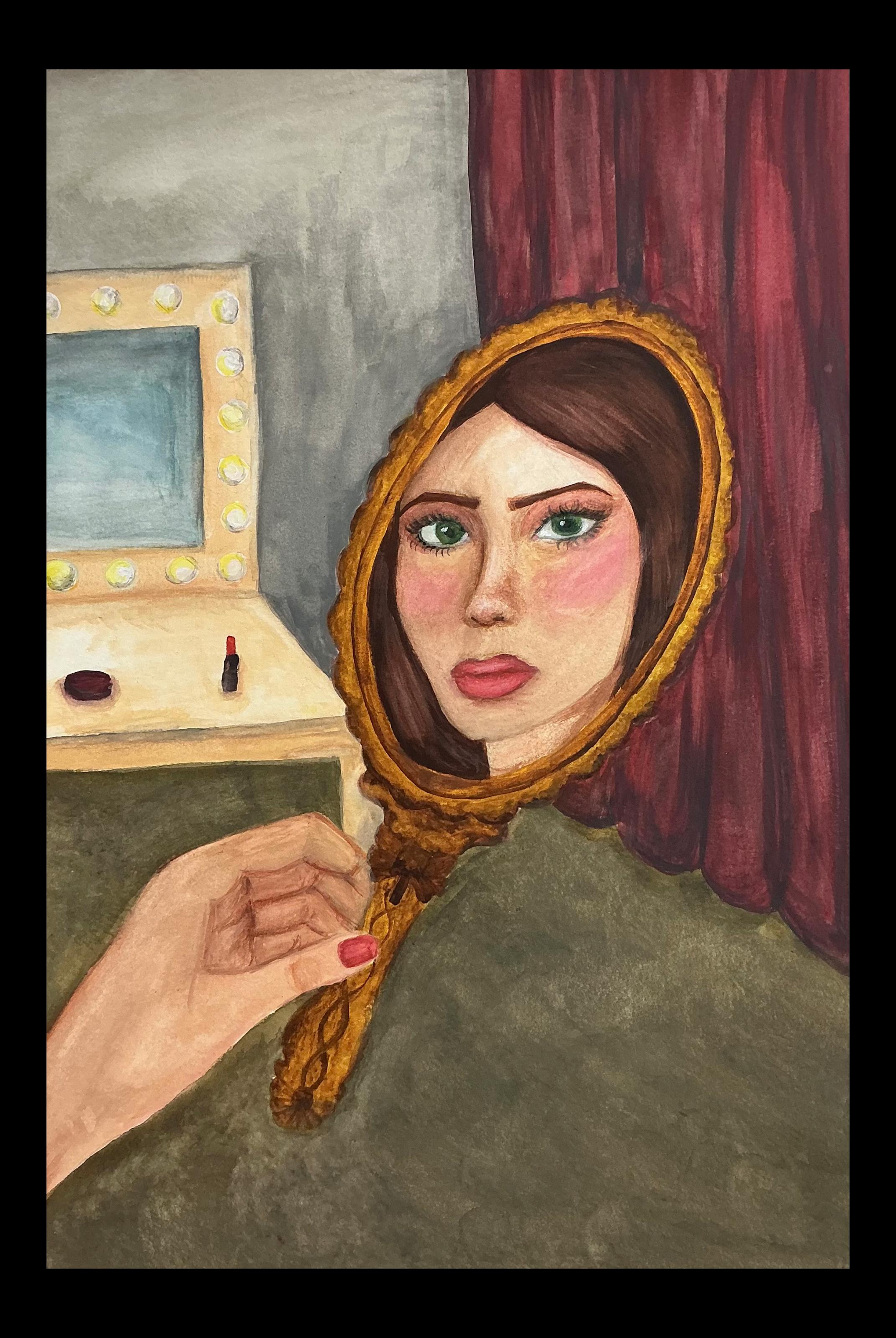 This piece captures that moment backstage when you ' re caught between who you are and who you ' re about to become. A reflection is a pause, an opportunity to connect with yourself prior to entering a new version of you. It mirrors real-life feelings of being in transition, standing at a threshold, and trying to make sense of the person staring back as you make your move from one space to the next.