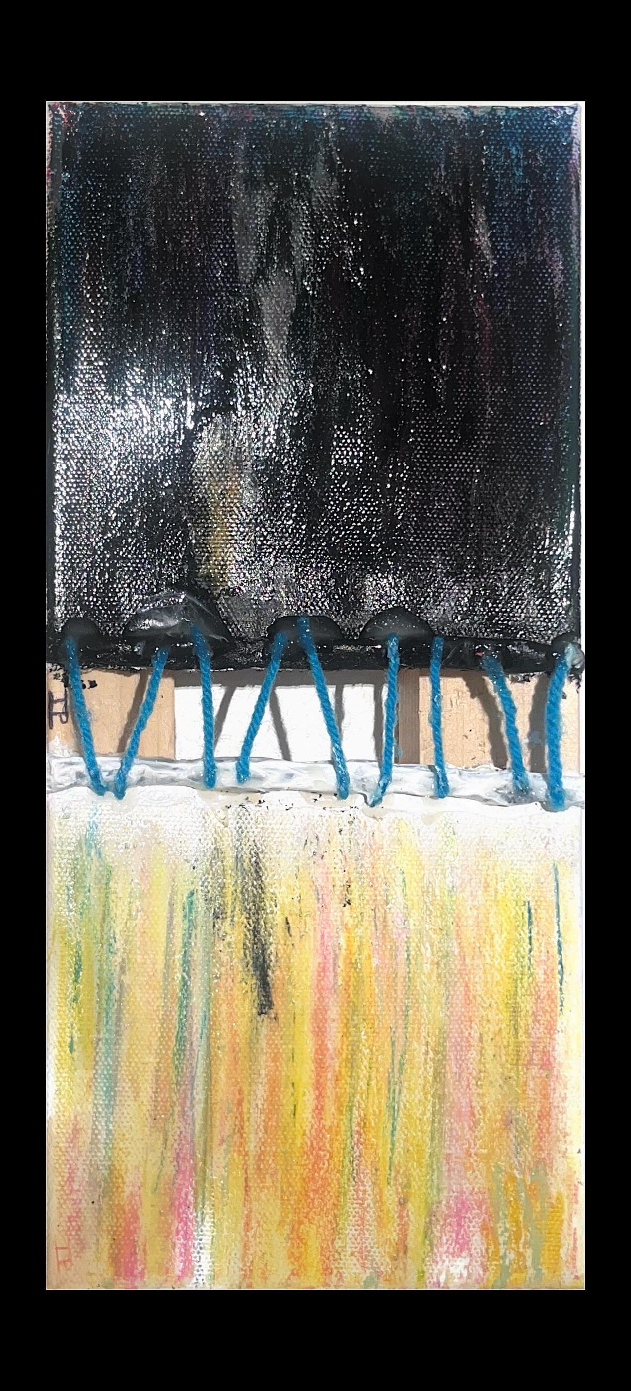 My piece is about the idea of a threshold. To me, this is the moment where I am in between two parts of my life. That’s why I split the canvas into a dark side and a light side. The dark side stands for things I am leaving behind, and the light side is what I am moving towards. I added the strings in the middle because even when we change or move forward, we’re still connected to where we came from. The little gap between the two sides is the actual threshold because that’s the space where everything feels confusing, but