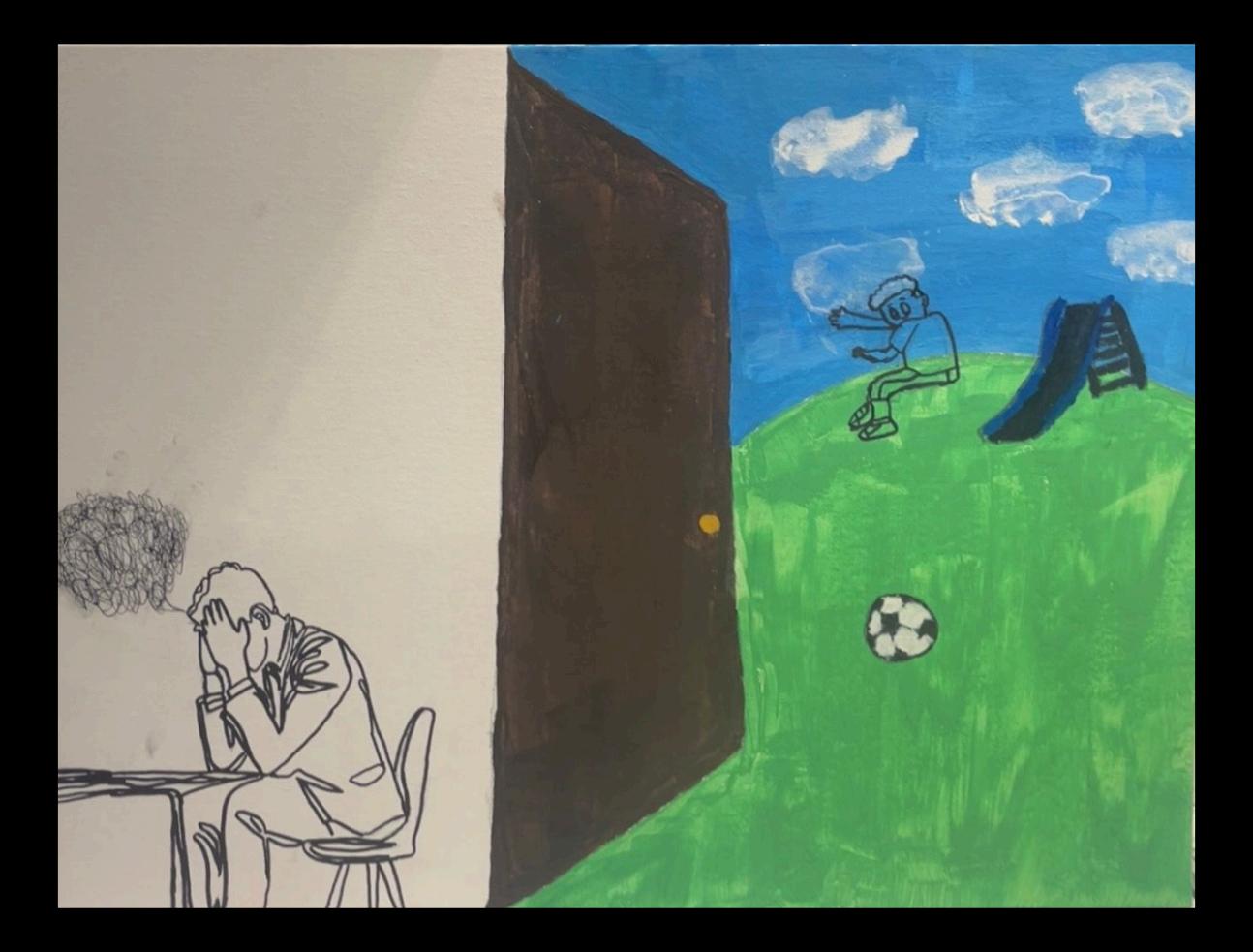 This painting shows a door standing between two worlds: childhood and adulthood. The door acts as a threshold, a point of transition, showing how we move from a bright, playful past into a stressful, complicated adult life. The open door lets us look back at where we came from while standing in the reality of where we are now.