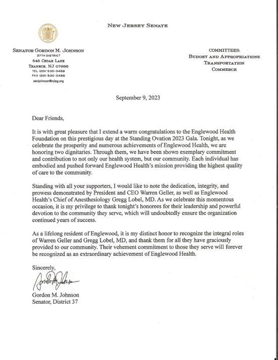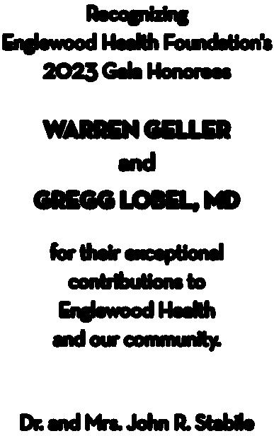 to tonight’s honorees, Warren Geller and Dr. Gregg Lobel. Your commitment to Englewood Health is We are honored to share this special evening with you both. Susan, Claire, June, Kiarah, Liza, Megan, Shanice and Geraldine