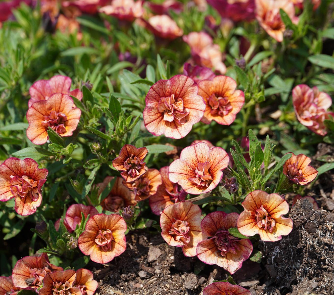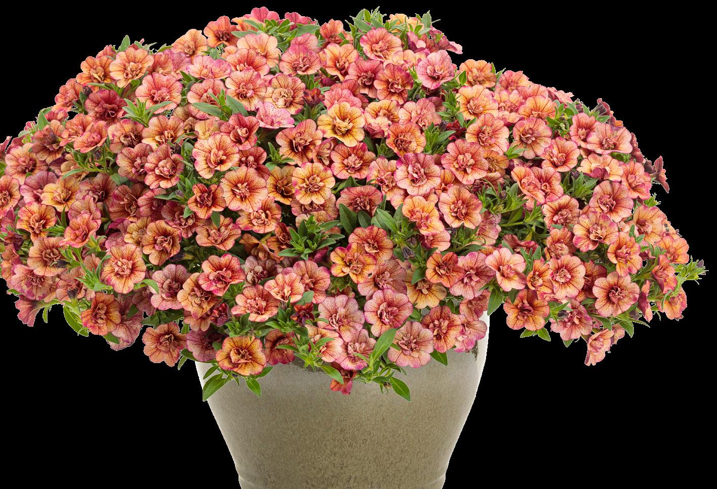 PROVEN WINNERS | This fully double-flowered calibrachoa showcases deep reds and purples, along with golds or creamy white tones, together creating a captivating display. With vintage aesthetics trending among consumers, this antique amber-orange veined calibrachoa with fully double flowers is sure to capture their attention. Outdoor growing environment draws out purple tones in the flowers.