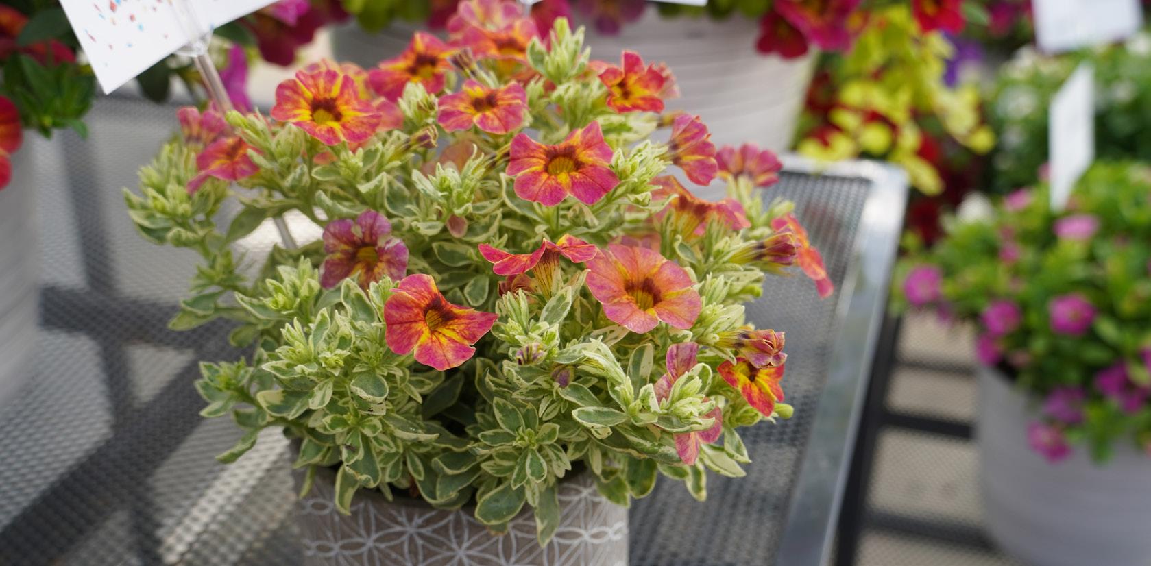 WESTHOFF FLOWERS | This variety features large flowers with toasty warm tones red-orange, beautifully stamped with a yellow star. Not only does Calibrachoa Calitastic® Cappuccino offer stunning blooms, but it also boasts a super tidy habit. Its compact and well-behaved growth creates a clean and polished look in the pot. Diverse in seasonal appeal, you could expand and elevate your spring or late summer program with this intro.