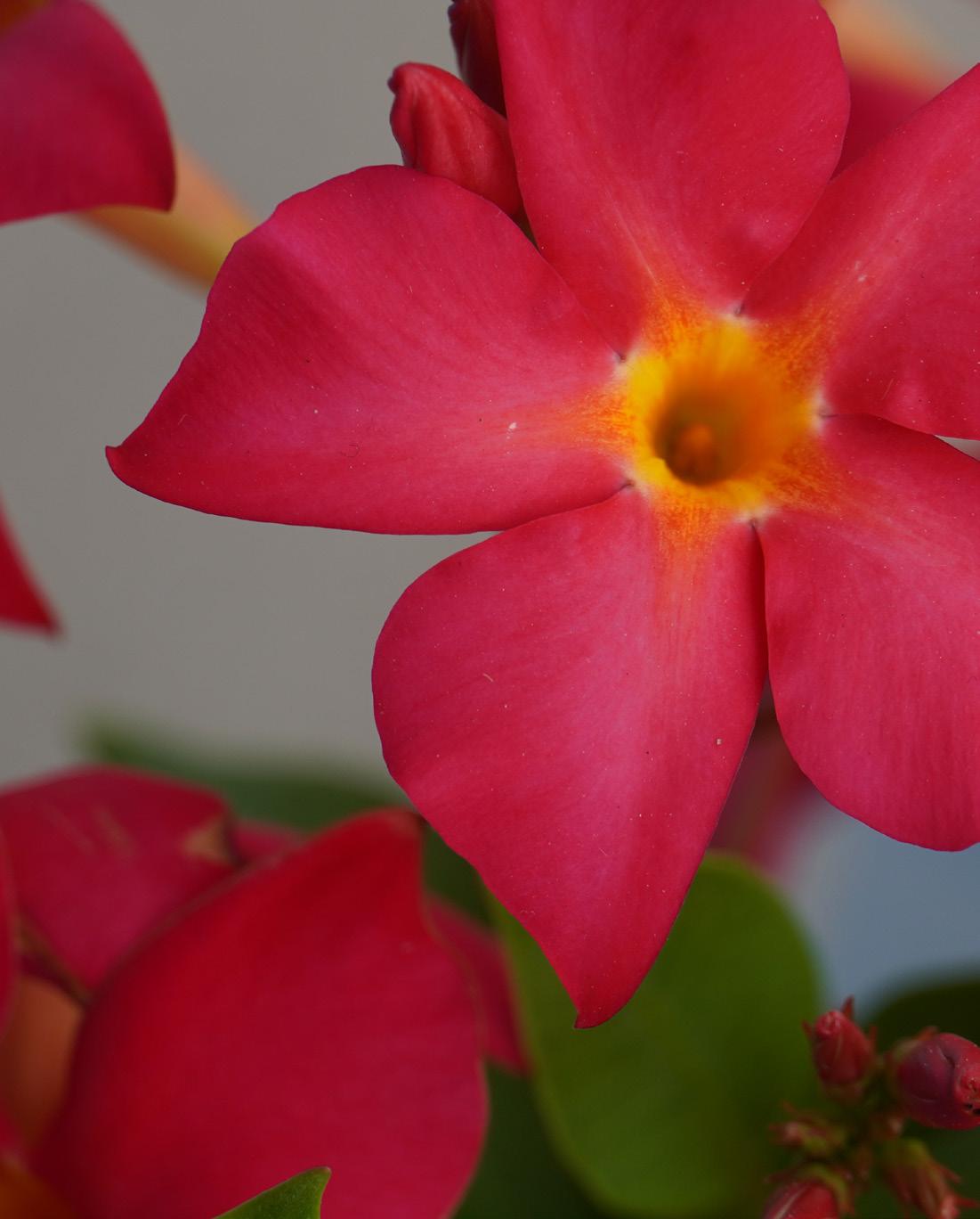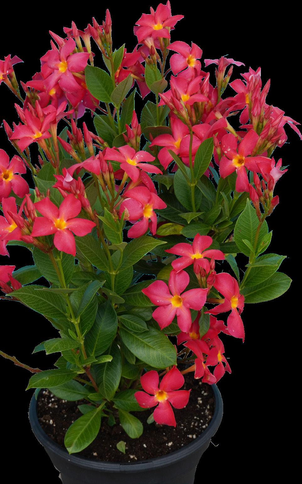 Following the bold debut of Orange, FiredUp Coral brings that same standout form in a color with broader design appeal. This non-vining mandevilla has a compact and bushy habit perfect for patios, containers, and thrillers. The pinwheel-shaped blooms glow with rich rose-coral petals and a yellow throat, delivering tropical impact in a softer palette that mixes easily with both brights and pastels. No trellis required, just nonstop blooms and easy care.