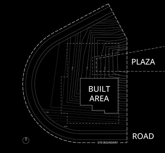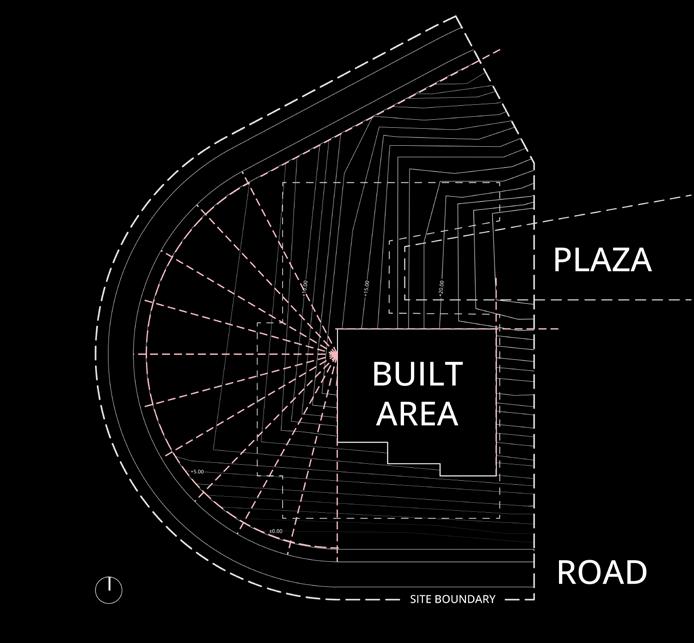 The diagram articulates topography contours, integrating the plaza and built area locations for a cohesive design synthesis.