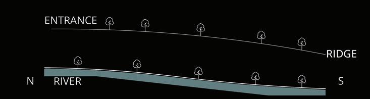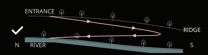 Negotiating the valley’s slope, my design strategically guides access from entrance to river, ensuring intuitive pathways.