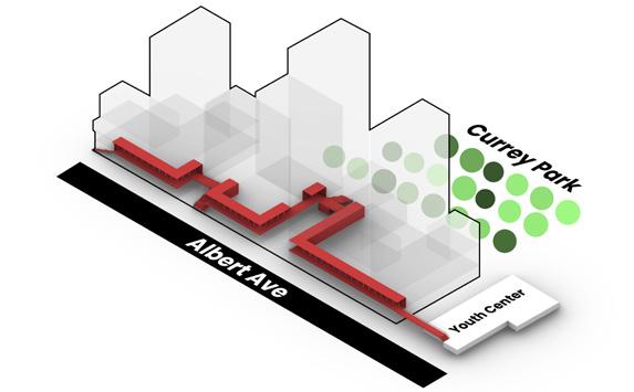 To blur the boundaries between private and public space and Achieve CPTED, we propose an elevated platform with cafés, restaurants, seating steps, and views over Currey Park and Scott Creek. This multifunctional space also creates a new access route from Albert Avenue to the Youth