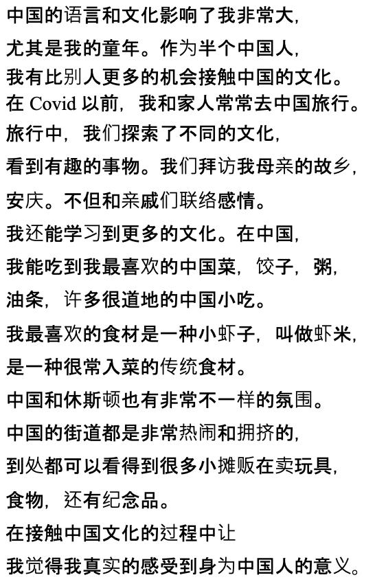 I was able to visit my mother’s hometown of Anging. One of my favorite parts of my vacations to China was the authentic food, like soup dumplings and fried dough. One of my favorite foods was a type of small shrimp called xiami. The atmosphere of China was also a big change from Houston. The streets were noisy and crowded, full of street vendors selling toys, food, and souveniers. I connecred with my culture and I learned what it meant to truly be Chinese.