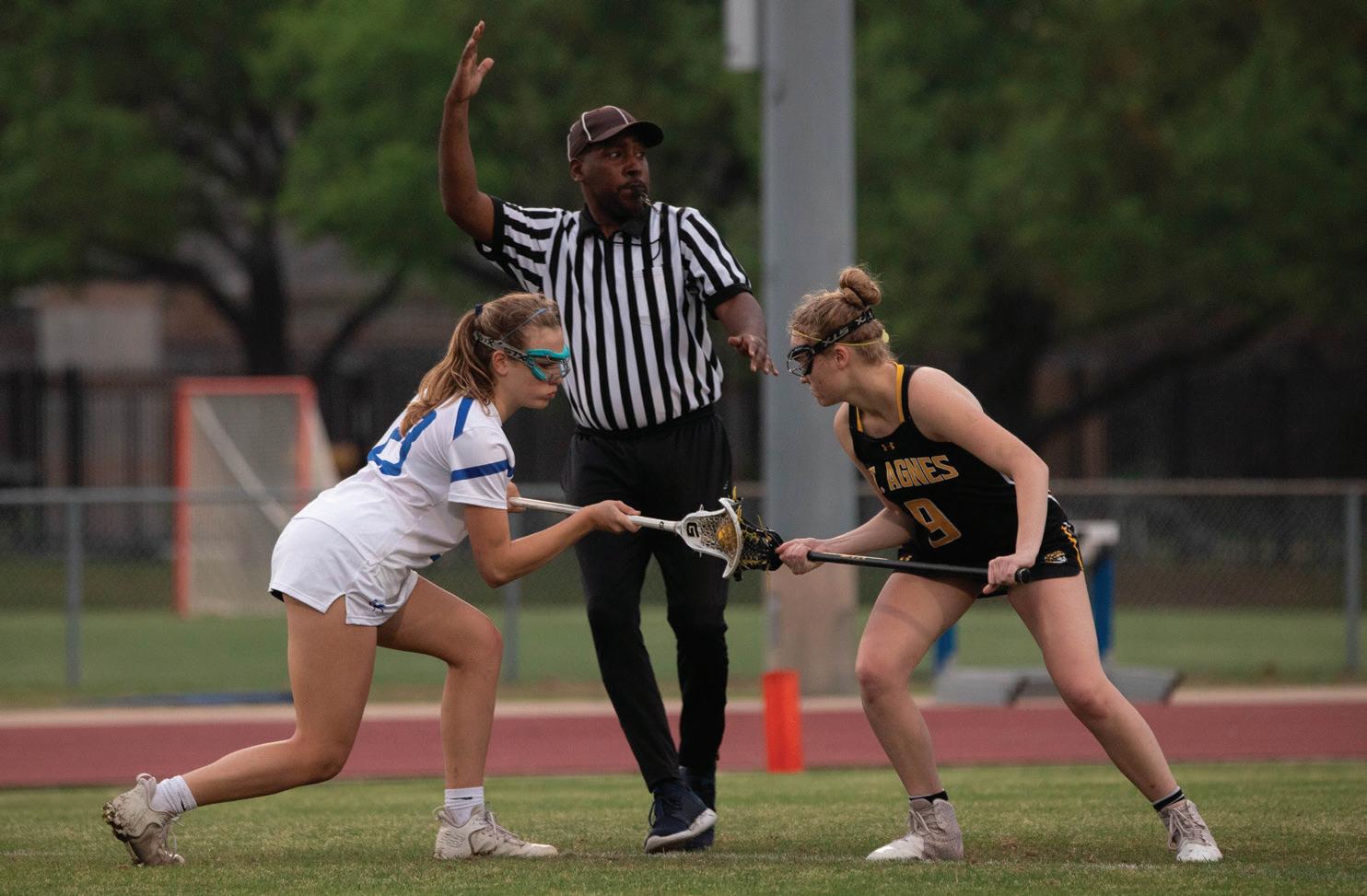 Greer Fuselier prepares for a draw against her St. Agnes opponent at the March 3 varsity girls lacrosse home game. Photo by Sydney Brooks.