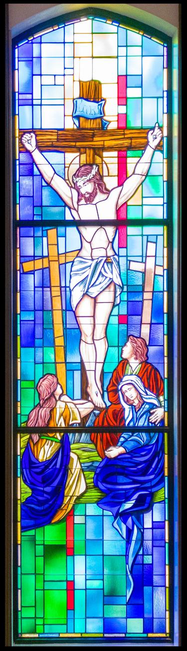 Jesus was executed by the Romans for the presumed crime of treason. Crucifixion was a particularly gruesome and public manner of execution, meant to inspire fear among any who would consider rebellion against Rome. The gospels tell us that at his trial before Pontius Pilate, Jesus was asked, “Are you the king of the Jews?” and on the cross over his head, we can see the sign that reads “INRI,” for the Latin “Iesus Nazarenus, Rex Iudaeorum” (Jesus of Nazareth, King of the Jews). We can also see two crosses behind him, reminding us of the two thieves who were crucified with Jesus that day. The crown of thorns circles his head, and one of his hands, nailed to the cross, points to heaven. The Gospel of John tells us that from the cross, Jesus committed his mother into John’s care, and in the window, we see him comforting her. Also at Jesus’ feet and to the left, we see Mary Magdalene, cloaked in purple and gold, signifying her wealth. Mary Magdalene was a very faithful follower of Jesus and one of the first witnesses to his resurrection.