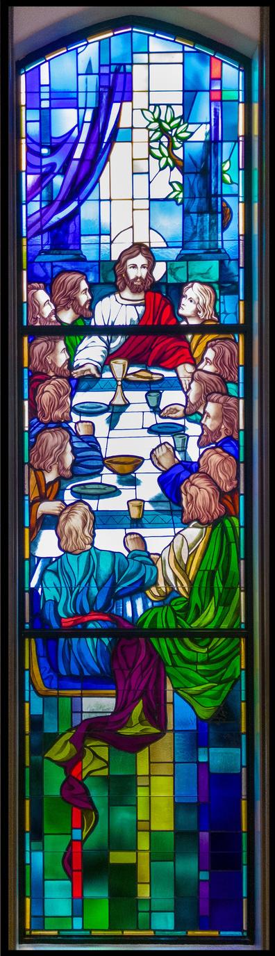 This window was given to the Glory of God in Honor of Robert Foster Parker and Hattie Brown Parker At Jesus’ Last Supper with his disciples, he took bread, blessed it, broke it, and gave it to his disciples, telling them that the bread was his body, given for them. He took wine and told his disciples that it was his blood shed for them. In our window, we can see all twelve disciples (Judas has not yet left to betray Jesus), who are all looking at Jesus. Jesus is gesturing with his hands. His is the only plate with bread on it. Behind Jesus, beyond the draped curtain and door frame, representing the Upper Room where they shared this meal, we can see an olive tree. After supper, Jesus will go to the Garden of Gethesemane on the Mount of Olives, to pray. It is there that he will be arrested. Again in this window, the light shines where Jesus is, and the further away from Jesus, the darker the glass is.