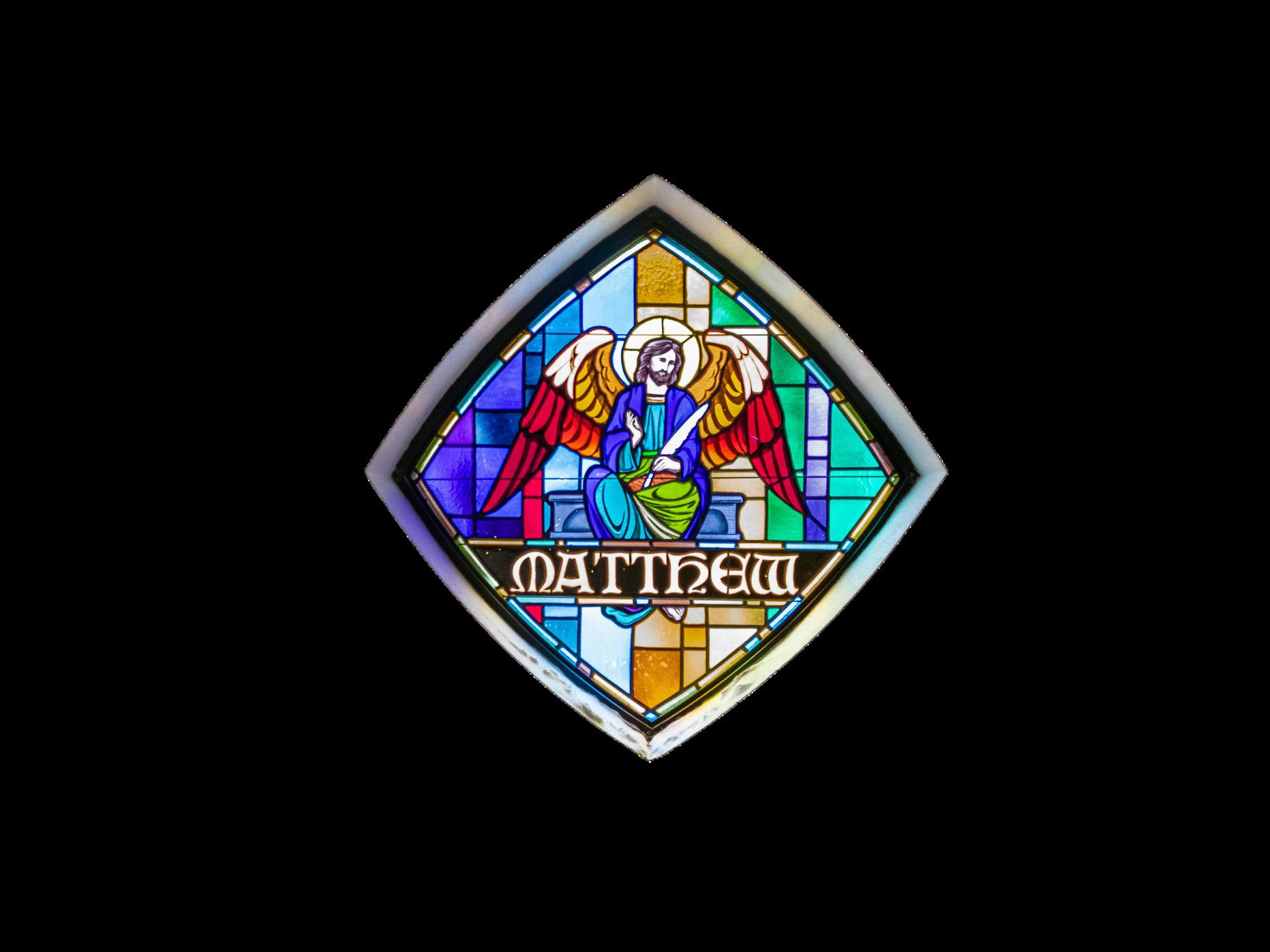 Matthew is symbolized by a winged man. It is thought that this is due to the way he begins his Gospel with a genealogy of Jesus, pointing out his human ancestry. In the window, the figure holds a quill in his left hand, signifying that Matthew was a writer, and has his right hand raised, as if teaching.