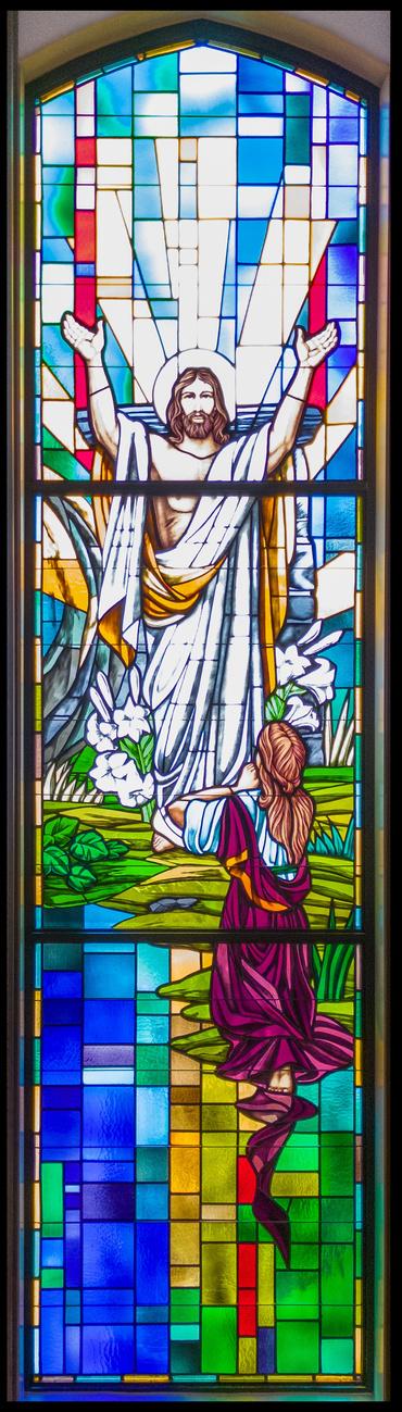 The Gospel of John records that Mary Magdalene went to the tomb by herself early Easter morning, while it was still dark. Discovering that the tomb had been opened, she was distraught and went to tell Peter and John, “They have taken the Lord out of the tomb, and we do not know where they have laid him.” Later, after returning to the tomb and first mistaking the risen Christ for a gardener, Mary recognized him when he called her by name. In our window, we can see the tomb behind Jesus, with the stone rolled away to the left. Jesus is now cloaked in white and gold, a color often used to symbolize divinity and power. In his side, we can see the wound where the soldiers had pierced him with a spear, and his hands, raised triumphantly, bear the marks of the nails. He is surrounded by Easter lilies, which grow from a bulb and represent both purity and resurrection. Mary Magdalene, cloaked in purple, kneels at his feet, and her hands are clutched at her chin in prayer and joy.