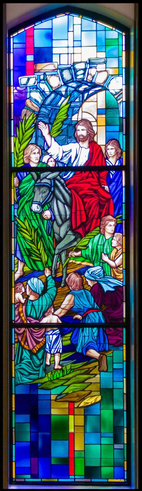 The story of Jesus’ triumphal entry into Jerusalem is recorded in all four gospels. All accounts mention him riding a colt or donkey. All except Luke mention the crowd waving palms or leafy branches. The arch, under which Jesus rides in the window, depicts a gateway or entry point into Jerusalem. He rides a donkey, and several men, women, and children wave palm fronds to welcome him. The gospels tell us they shouted, “Blessed is the one who comes in the name of the Lord the King of Israel!” The crowds are thus greeting Jesus as the victorious messianic king. The donkey he rides, however, indicated that he came humbly and peacefully, in contrast to the governor Pilate, who traditionally made a show of entering Jerusalem on a war horse and accompanied by soldiers each year at Passover. The crowds include adults and children, but it is noteworthy that they all have very sober expressions. Are they worried about what the coming of the messianic king might mean for them? Do they sense that Jesus’ triumphal entry into Jerusalem will put into play the series of events that will lead to his crucifixion?